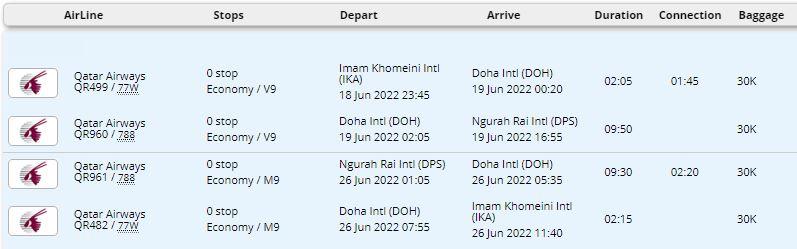 - پرواز قطری (تهران - دوحه - بالی و برعکس)