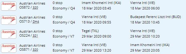 - پرواز اتریشی (رفت: تهران-وین-بوداپست) (برگشت: برلین-وین-تهران)