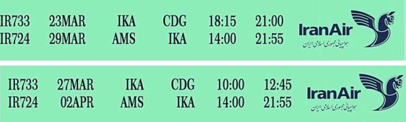 - پرواز ایران ایر (رفت: تهران- پاریس/ برگشت: آمستردام -تهران)