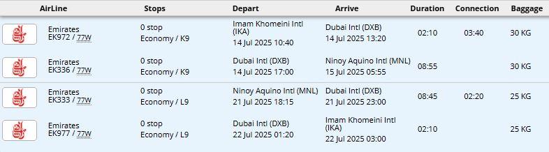 - پرواز امارات تهران / دوبی/ مانیل و بالعکس