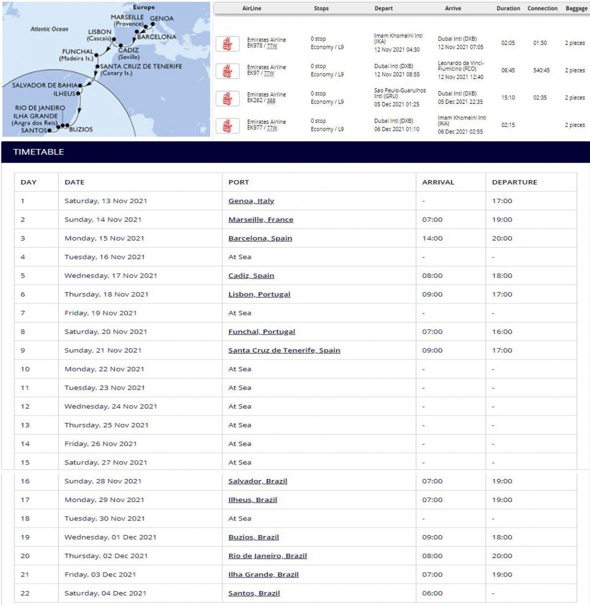 - به علت اینکه حرکت کشتی از شهر جنوا ایتالیا بوده و پرواز رفت شما به شهر رم میباشد، ترجیح این است که یک شب اول سفرتان را در جنوا هتل داشته باشید.