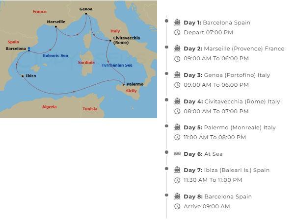 در تمام این روز کروز در حال طی کردن مسیر خود در دریای مدیترانه میباشد و شما میتوانید از برنامه های متنوع و تفریحات بی پایان کشتی استفاده کنید.