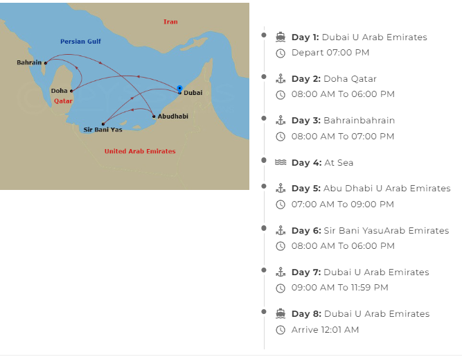 در ساعت 9 صبح به دبی خواهید رسید و تا فردا ساعت 12 ظهر این کشتی بصورت هتل در ساحل دبی پذیرای شما خواهد بود و فرصت کافی برای گشت در دبی و بازگشت به کشتی بصورت چندباره را خواهید داشت.